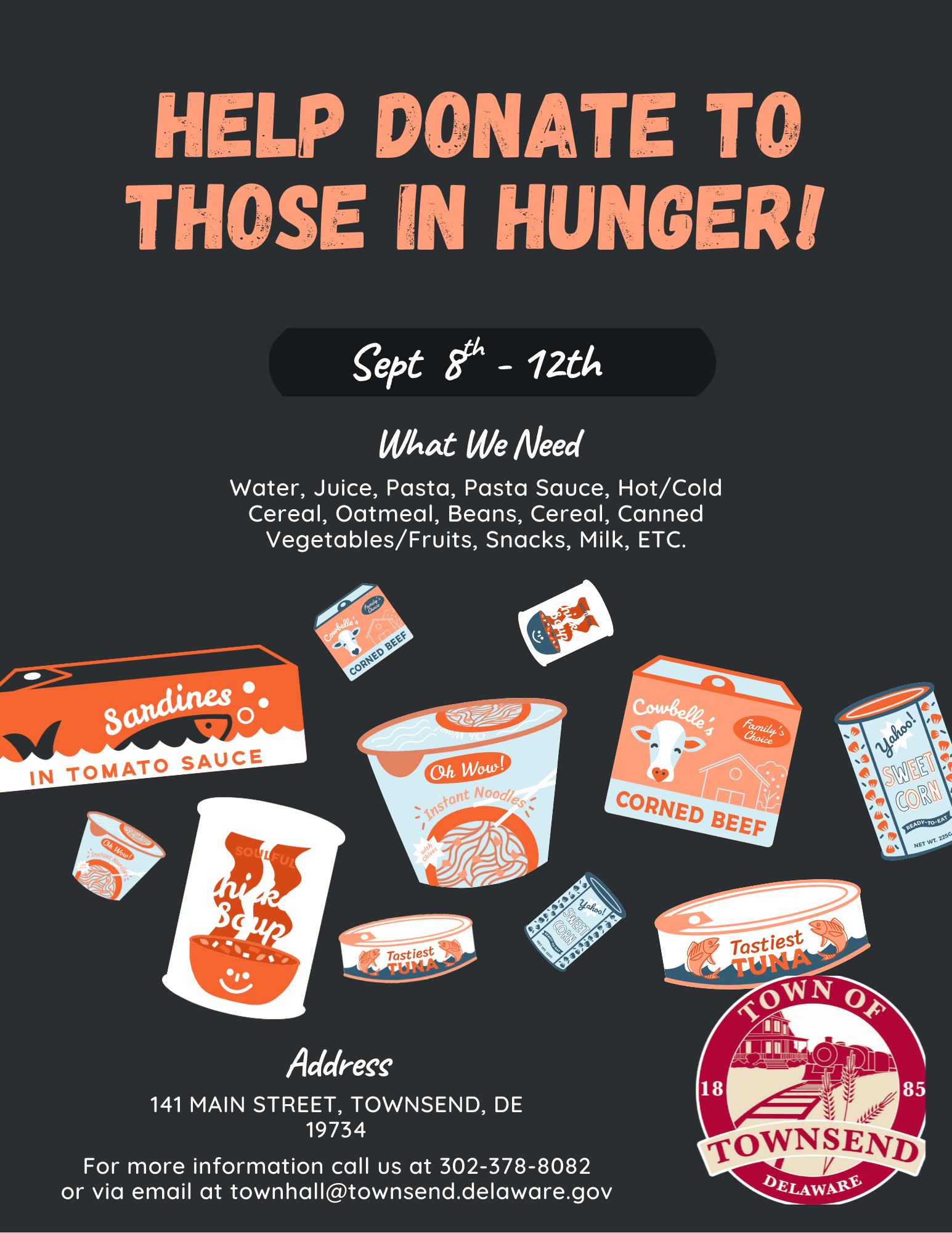 Date Posted: Wednesday, September 3rd, 2025Townsend Town Hall is proud to join the Food Bank of Delaware in recognizing Hunger Action Day by hosting a community Food Drive.